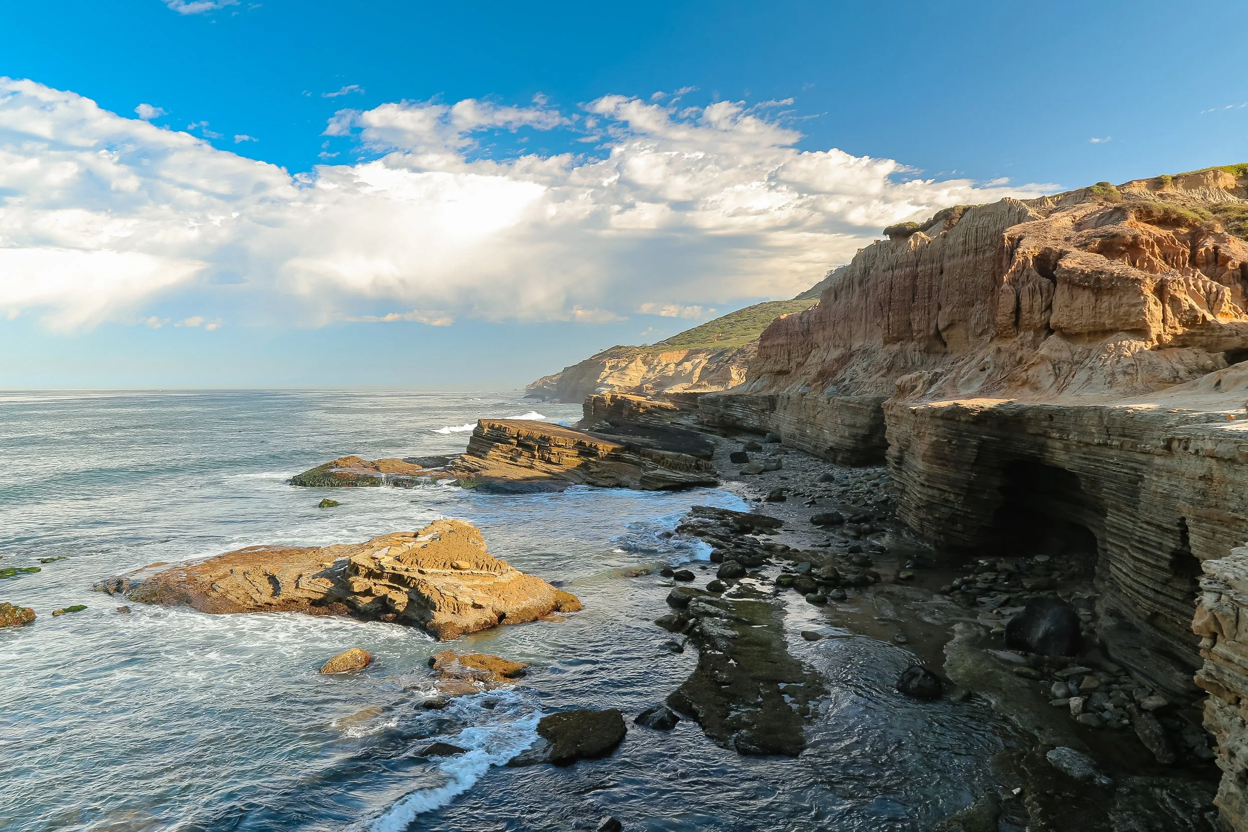 A winter storm begins to clear, leaving snow dusted mountains and a rainbow across a gray clouded sky.